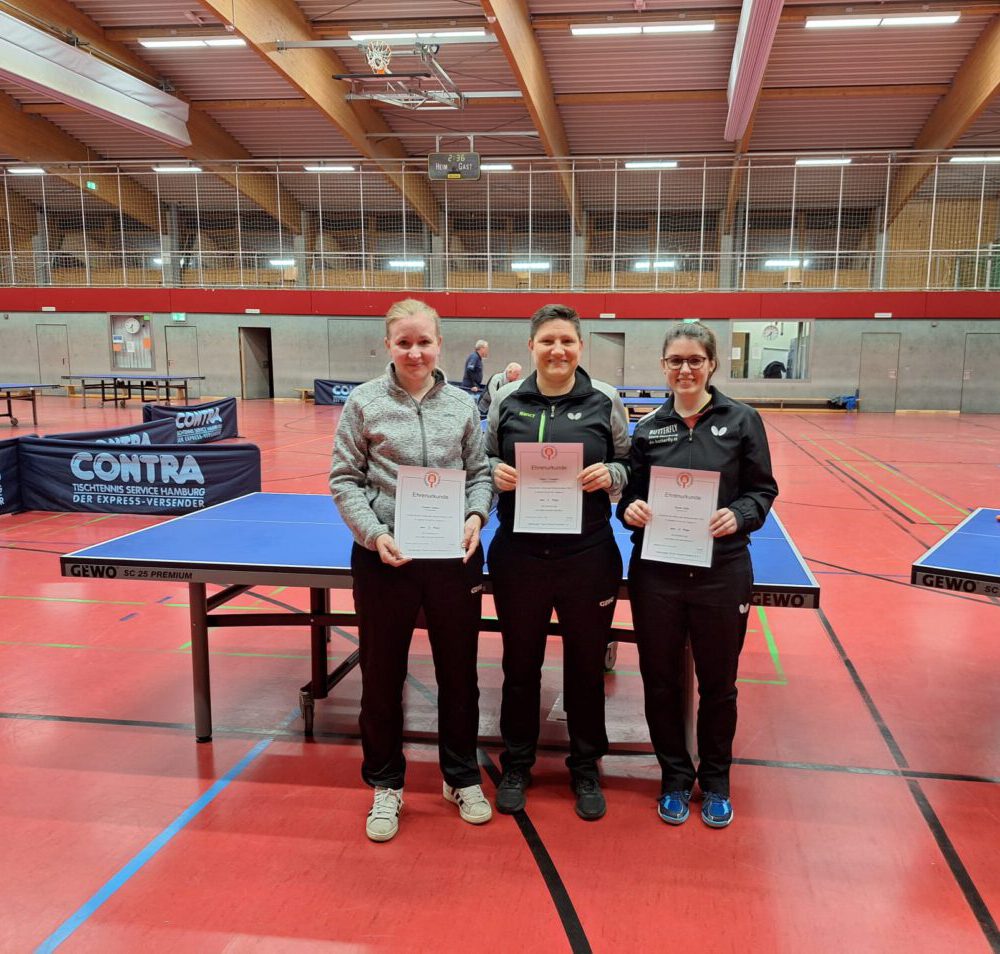 Bei den Hamburger Meisterschaften der Senioren wurden wir in der Klasse Damen S40 von Nancy vertreten. Bei 4 Anmeldungen wurde in einer Gruppe jeder gegen jeden die Gewinnerin ausgespielt. Sensationell konnte Nancy ihr erstes Einzel gegen die mit 150 Punkten höher notierte Regionalligaspielerin Jasmin Halabi mit 3:1 gewinnen. Da sie auch gegen die Oberliga-Spielerin Nicola Kölln „nur“ 2:3 verlor und das letzte Spiel gegen Eva Backes 3:0 für sich entscheiden konnte, stand am Ende ein 2:1 Spielverhältnis und 8:4 Sätze zu Buche – dieses Ergebnis bedeutete am Ende den 1. Platz und somit den Titel.